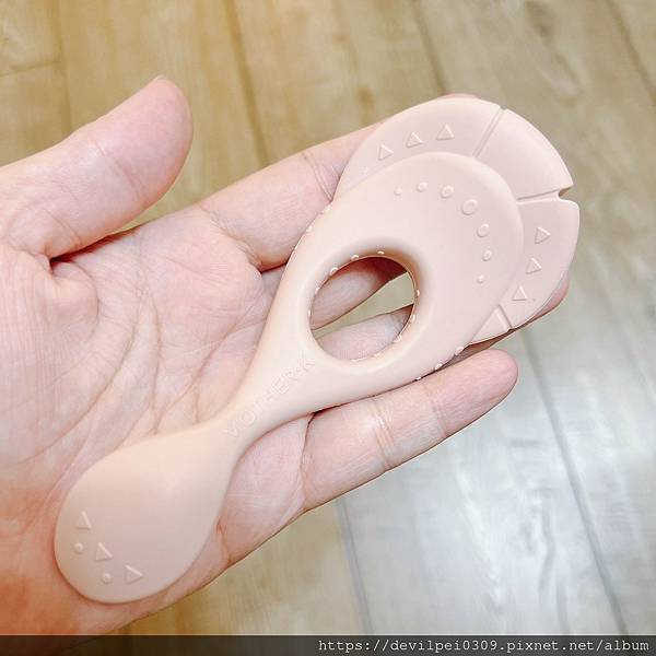 而湯匙的正反面和挖洞內部,都有【凸起】設計,有【圓形】也有【三角形】,也能刺激寶寶手部的觸覺